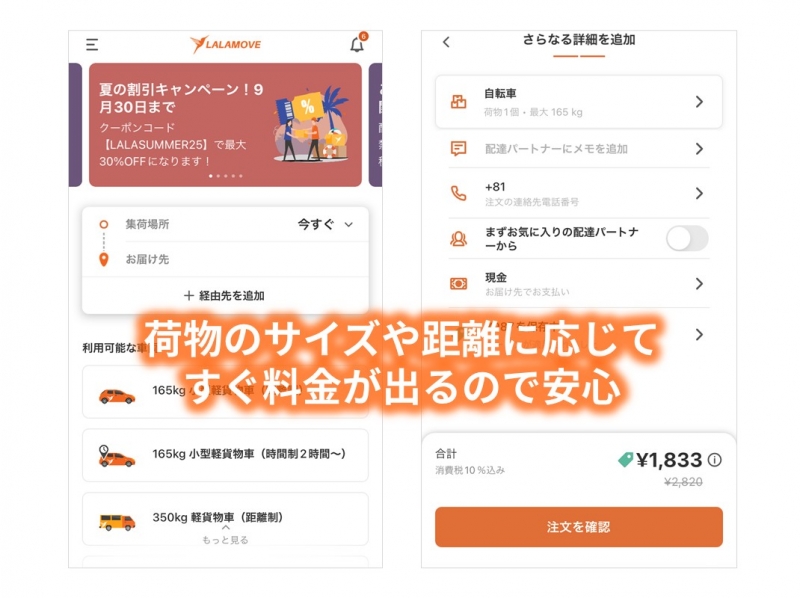アプリを開けば距離制・時間制の料金をその場で確認でき、簡単に依頼できます。