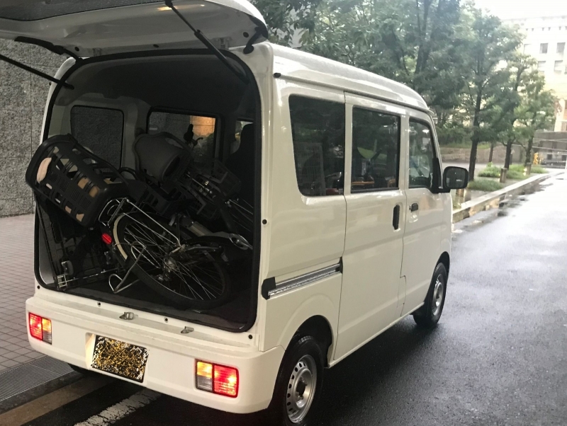 雨の中でも、チャイルドシート付きの電動自転車を丁寧に積み込み。安心して任せられました。