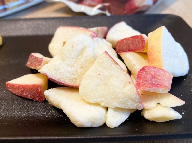 りんごは、ホワイトチョコレートのパリッとした食感と、フリーズドライのりんごのサクサクとした軽さが一緒に楽しめます。口の中で少しずつ溶けていくうちに、わずかにしっとりとした感触に変化。皮には、果肉とは違った噛みごたえがあります。