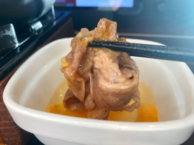 牛肉を溶き卵にくぐらせてひと口。甘辛いたれの風味が卵でまろやかになり、ご飯との相性は抜群でした。牛肉はやわらかく、たれのうまみをたっぷり吸っています。