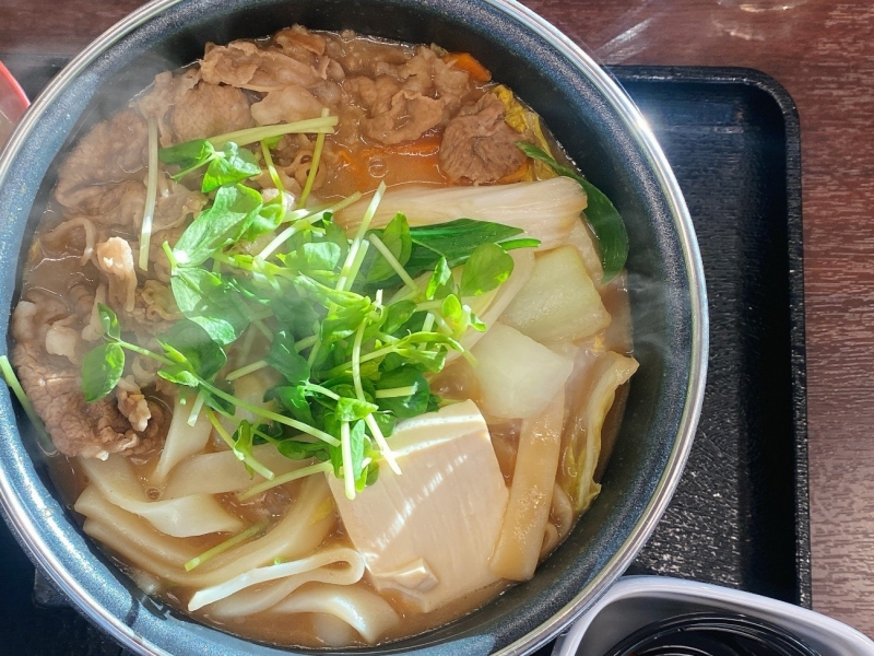 白菜はくたくたに煮えていて、噛むとたれがじゅわっとあふれ出します。平たいきしめんはたれをよく拾って、もちもちとした歯ごたえ。豆苗のシャキッとした食感や、絹豆腐のつるんとした口あたりがアクセントになっています。