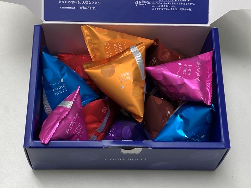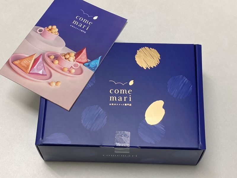 上品で落ち着いたネイビーのボックスが印象的な「comemari」のお米スナックを試してみました。