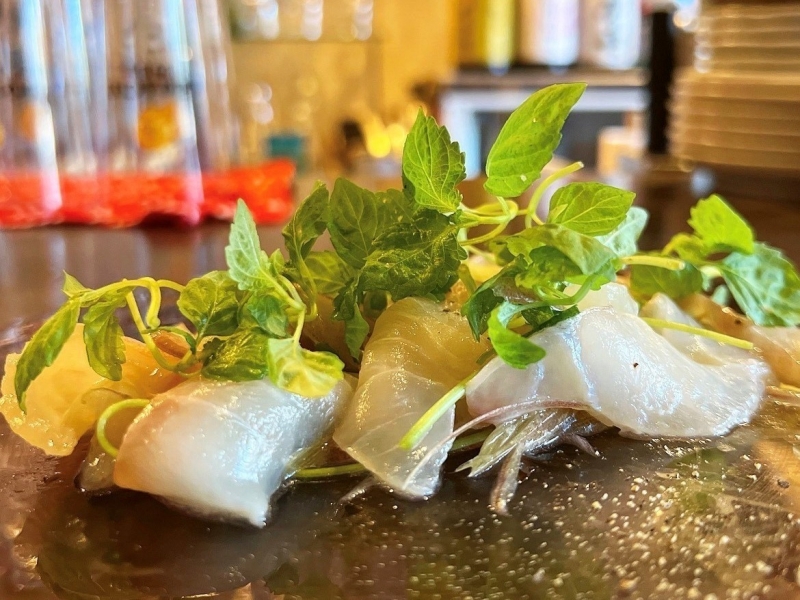 【京都市 左京区 Bar電球】藻塩や鮎の魚醤で風味豊かに仕上げた「白身のカルパッチョ」イタリアンと和食ベースの創作料理と店主厳選のお酒が堪能できるダイニングバー