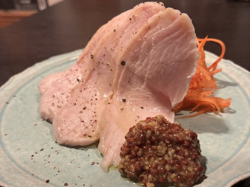 朝引き国産鶏の新鮮な胸肉を、サトウキビ粉末と荒塩を振って熟成させ、低温調理でじっくり旨みを閉じ込めた自家製鶏ハム。