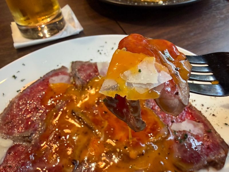 口に入れたとたんに広がる、やわらかな食感と濃厚な肉のうまみ。イチボの持ち味が生きた味わいです。卵黄をからめると、濃厚でまろやかな口あたりに変化。最後まで“お肉の味”を楽しめる一皿です。